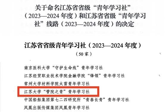 近日,共青团江苏省委下发《关于命名江苏省省级“青年学习社”(2023—2024年度)和江苏省省级“青年学习社”线路(2023—2024年度)的决定》,我校“管院之青”青年学习社获评2023-2024年度江苏省省级青年学习社,全省共6所高校青年学习社获命名。